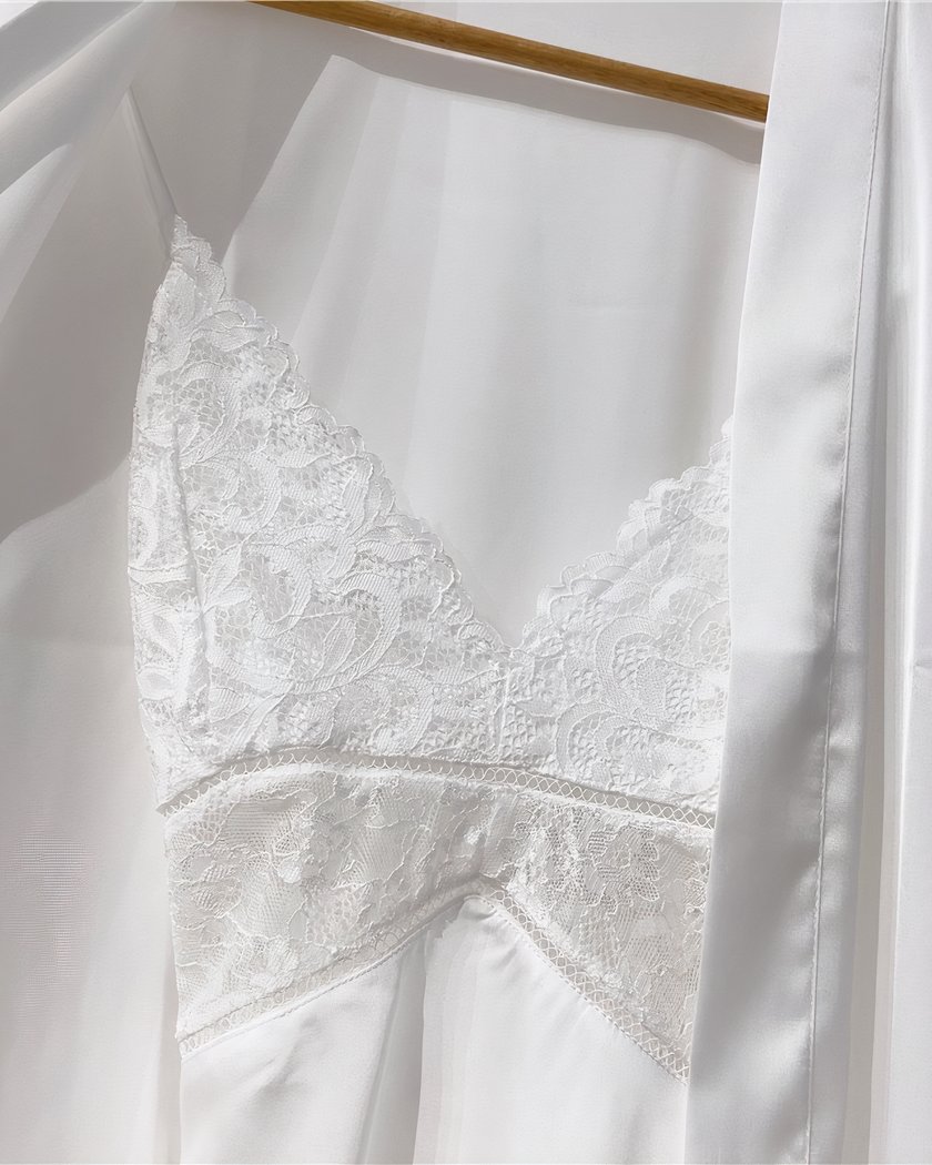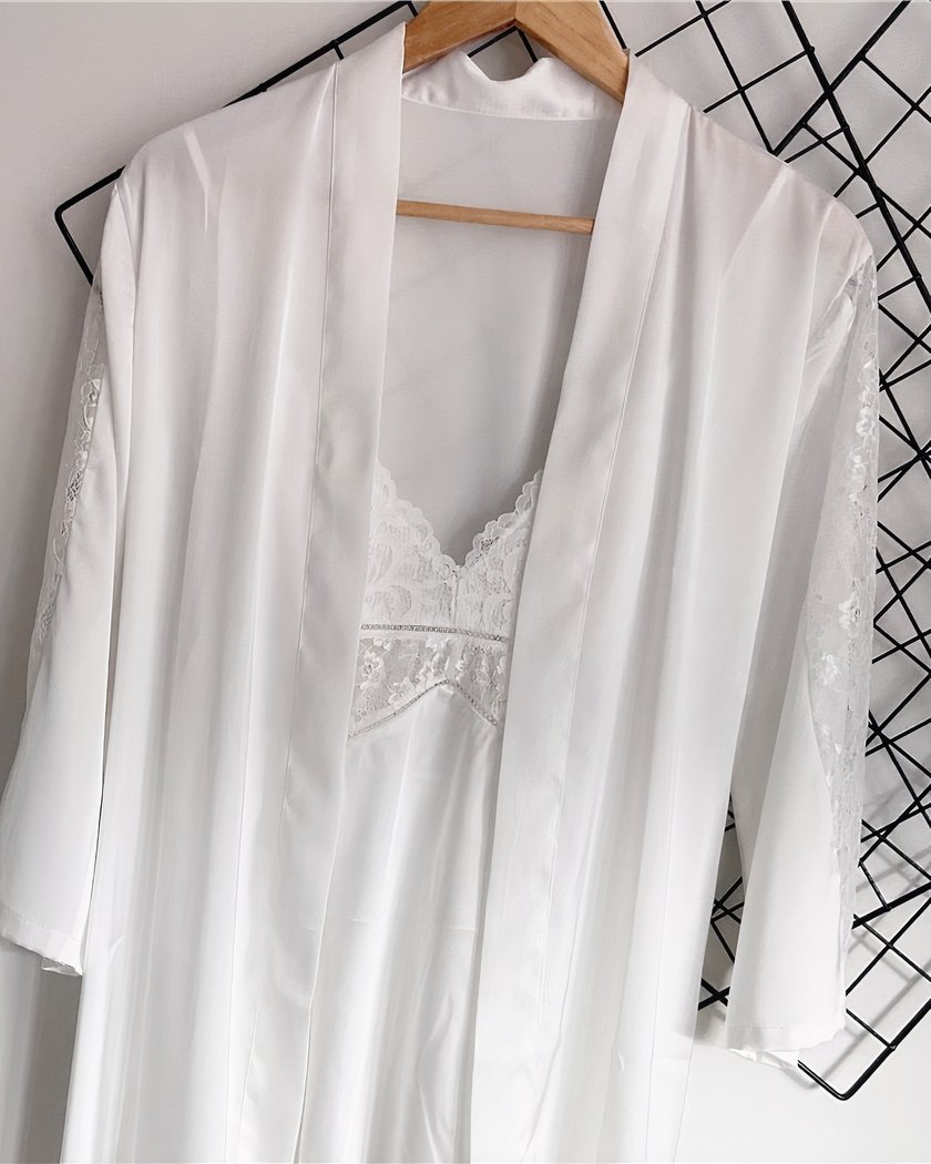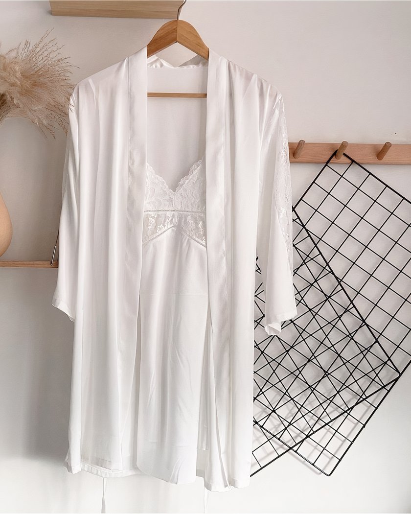 Cet ensemble de lingerie est composé d’une nuisette et d’un kimono en dentelle délicate. La nuisette courte est légèrement transparente avec un décolleté en dentelle et des fines bretelles réglables. Le kimono assorti a des manches trois-quarts et une ceinture à nouer, créant un look chic et élégant. Parfait pour une soirée romantique ou comme cadeau pour votre partenaire.