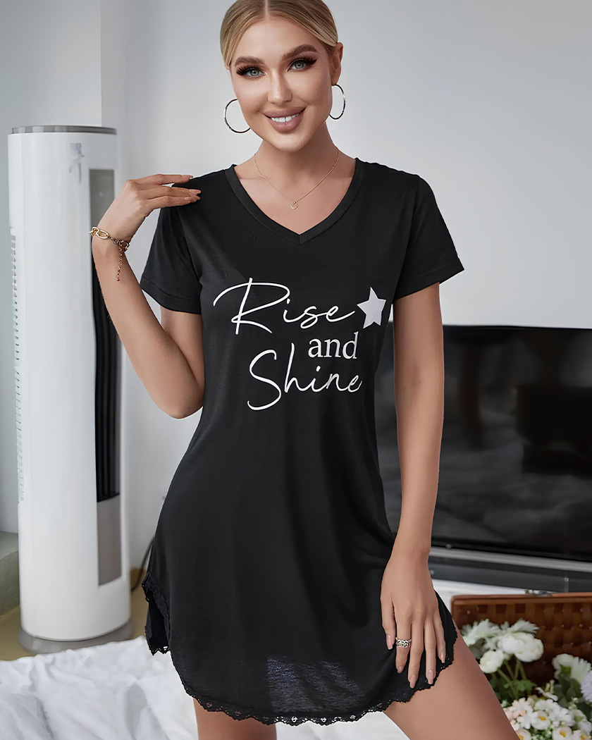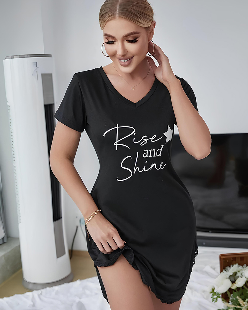 Cette nuisette manche courte noire se démarque par sa coupe séduisante et son col en V qui soulignent délicatement la silhouette et épouse subtilement vos courbes.