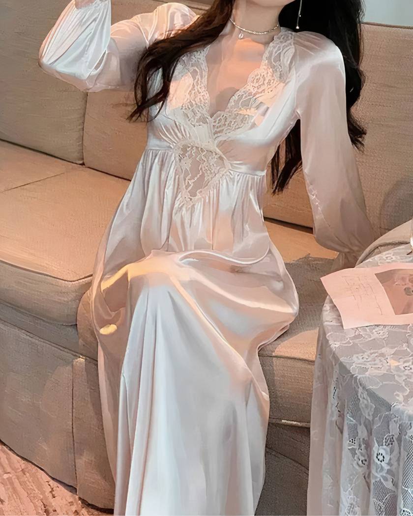Appréciez le mélange parfait d’élégance et de confort avec notre nuisette à manches longues en dentelle. Confectionnée dans un tissu doux et lumineux, elle offre une coupe qui descend gracieusement jusqu’aux bas des jambes, assurant une aisance totale tout en restant stylée.