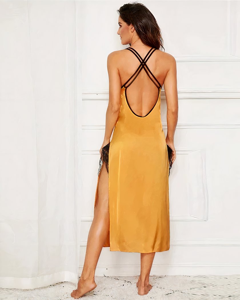 Le design de cette nuisette avec son dos nu et ses fentes hautes est la quintessence de la sensualité. Le dos nu offre un aspect séduisant et raffiné, tandis que les fentes hautes sur les côtés apportent une touche de modernité et de liberté, permettant une aisance de mouvement tout en soulignant la silhouette.