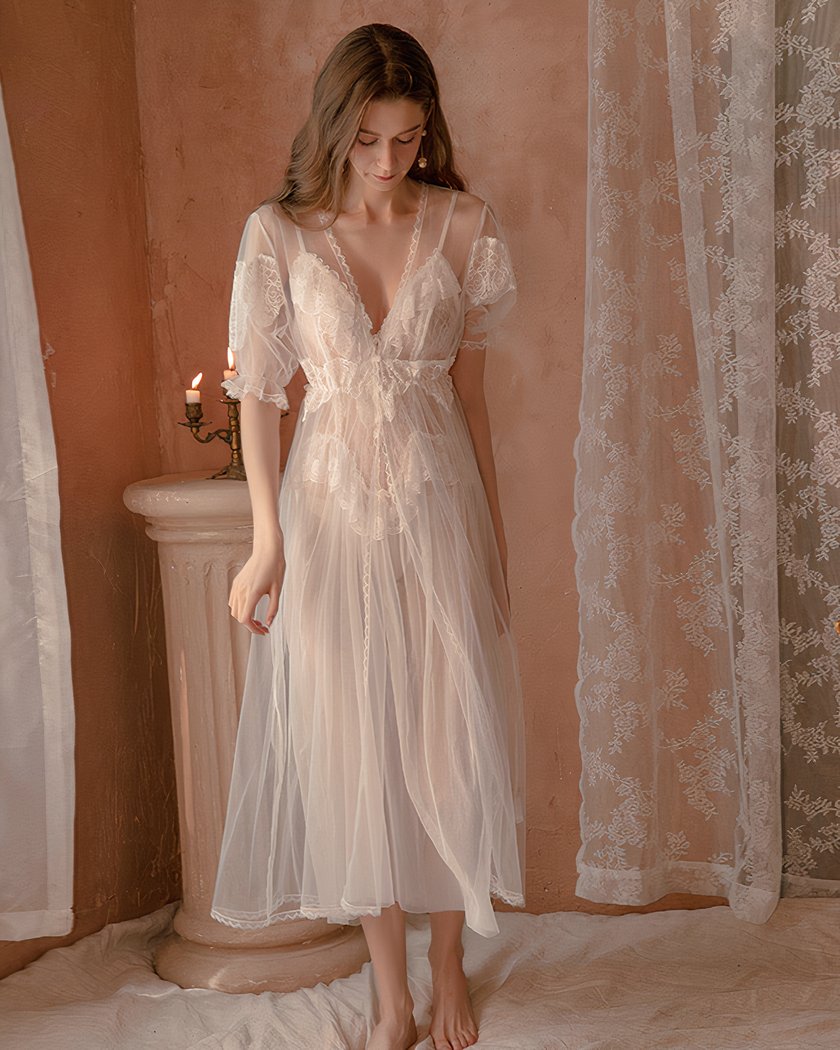 Le jeu de dentelle raffinée ornant cette nuisette vintage ajoute une note sensuelle et sophistiquée à l’ensemble. Ce modèle de nuisette transparente s’adapte idéalement à votre morphologie pour un ajustement sur mesure.