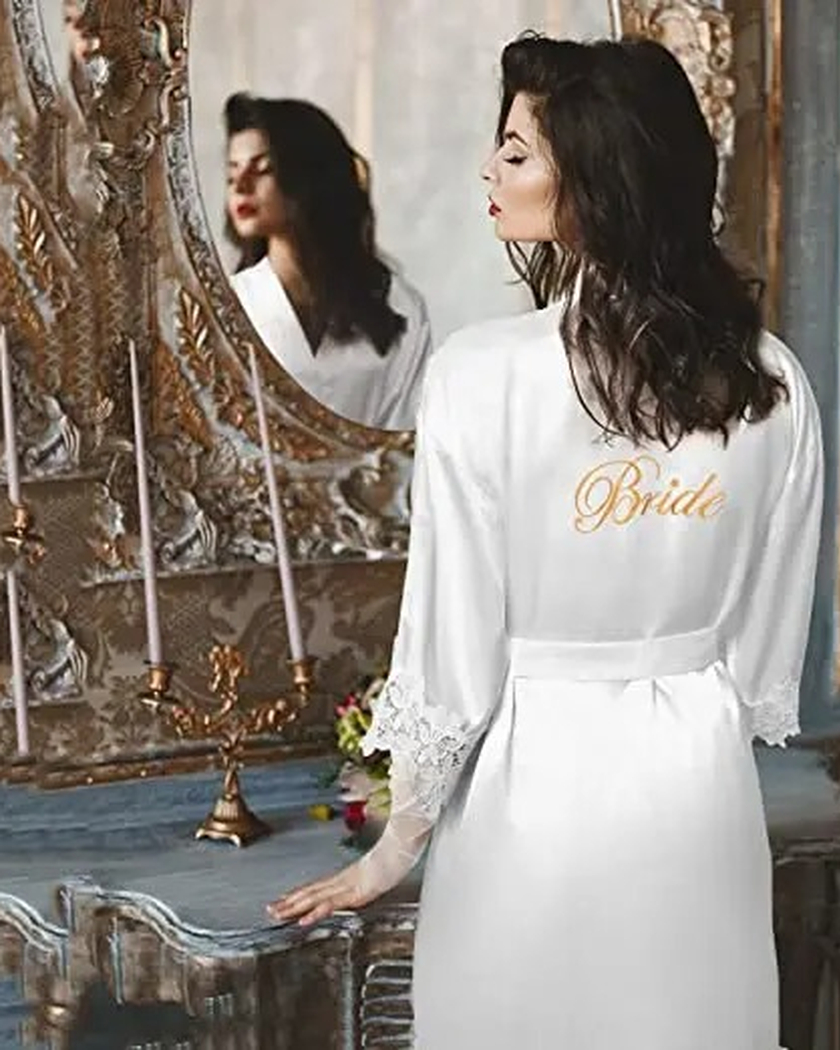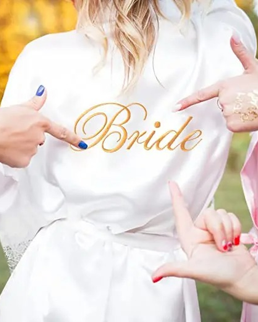 Bien plus qu’un accessoire, ce peignoir devient le témoin privilégié des heures joyeuses précédant le grand jour. Chaque détail a été pensé pour faire de ce vêtement une pièce mémorable : l’inscription « Bride » ou « Bridesmaid » en lettres dorées vient souligner le rôle de chacune avec élégance.
