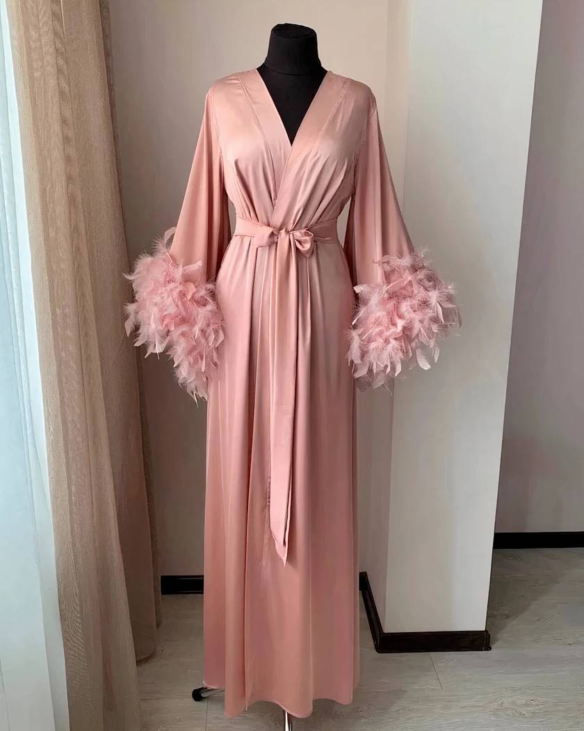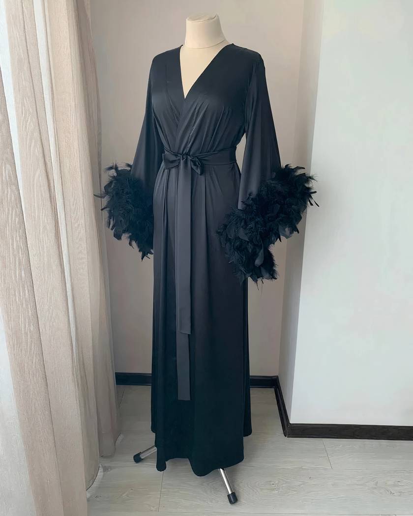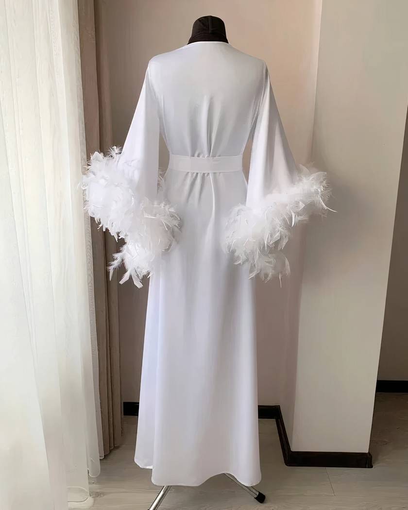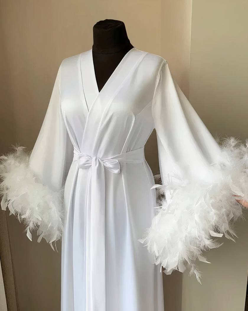 Découvrez notre peignoir bride long et fluide, conçu pour une allure classe et élégante en toute circonstance. Ses manches amples en plume blanche ajoutent une touche distinguée et raffinée. Doté d’une ceinture entièrement ajustable, il s’adapte parfaitement à vos envies et met en valeur votre silhouette.
