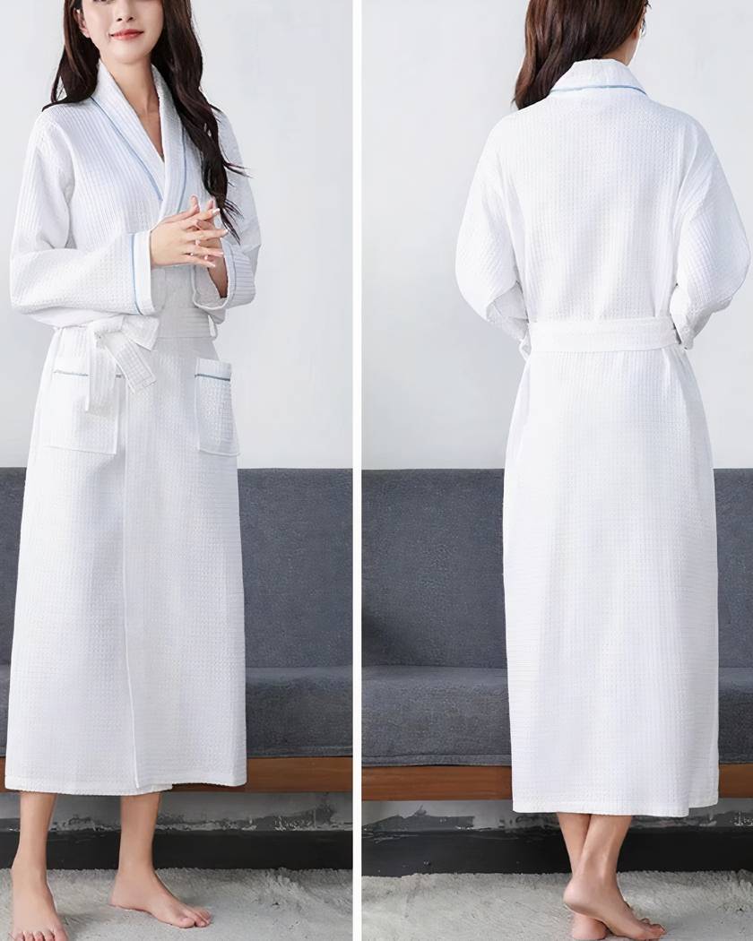 La ceinture ajustable vous offre un confort personnalisé et met en valeur votre silhouette avec raffinement. Avec son liseré bleu délicat, il est la tenue idéale pour ceux qui recherchent à la fois fonctionnalité et style. Ce peignoir transforme chaque moment de détente en une expérience chic et pratique, parfaite pour toute occasion.
