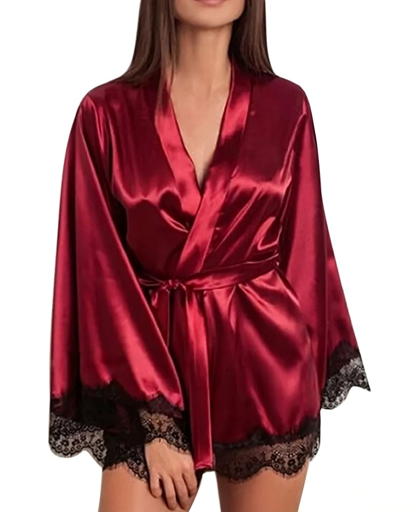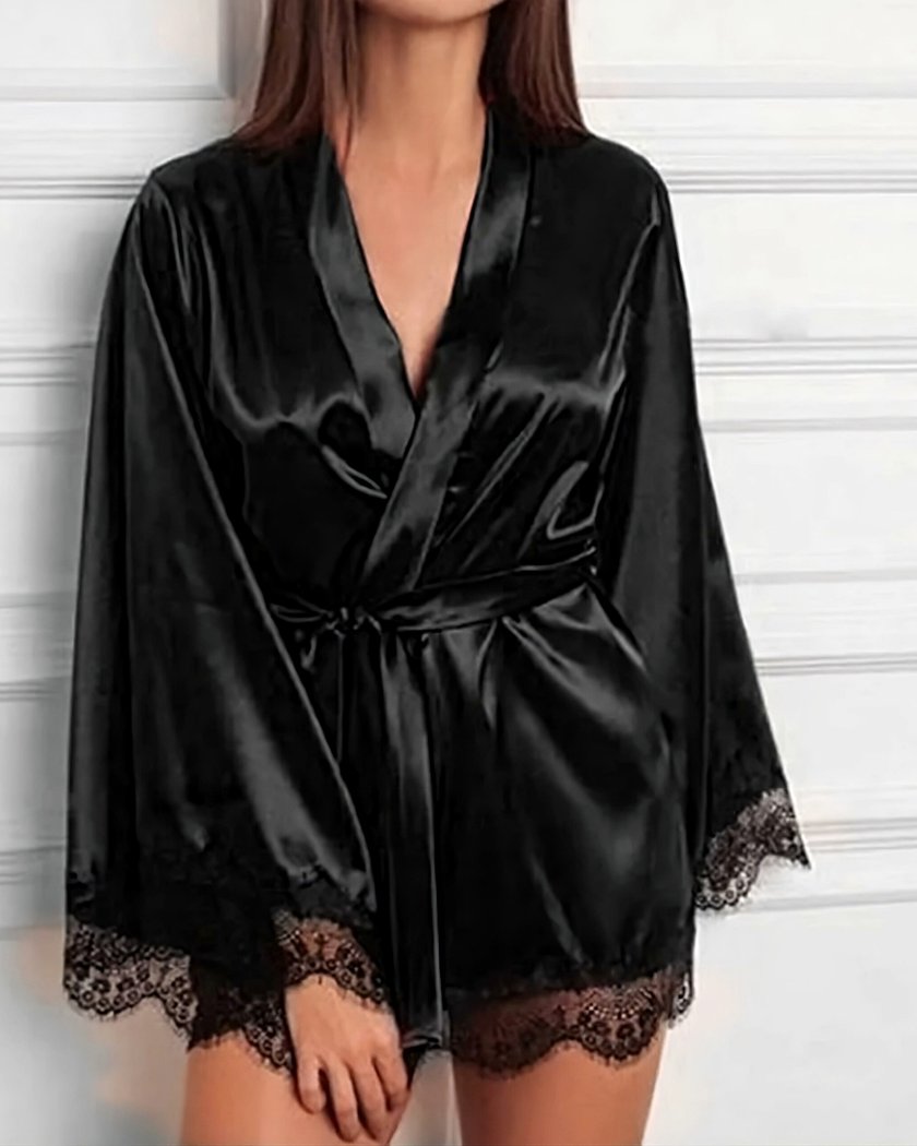 Sublimez vos soirées avec notre kimono satiné glamour et raffiné, décoré de dentelle fine. Idéal pour une nuit romantique avec votre moitié, il offre à la fois confort et charme. Les manches longues en dentelle garantissent une aisance parfaite, et le nœud réglable permet un ajustement sur mesure.
